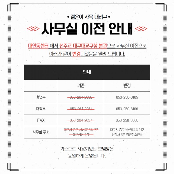 사무실 이전 안내 페이지 정보 작성자 관리자 댓글 0건 조회 208회 작성일 25-12-22 11:51 본문 찬미예수님~대안동센터 사무실이 천주교 대구대교구청 본관으로 이전했습니다! 댓글목록 댓글목록 등록된 댓글이 없습니다. 목록 이전글2026년 청년청소년국 청년사목 일정표 25.12.23 다음글“탈리타 쿰”7기 신청서/계획서 25.09.17