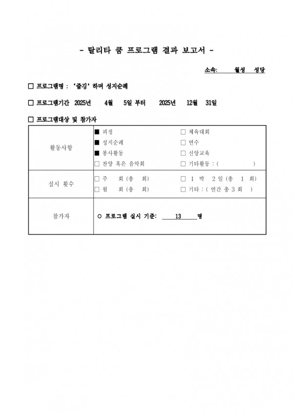[탈리타쿰6] 월성 성당 - '줍깅' 하며 성지순례 페이지 정보 작성자 관리자 댓글 0건 조회 1회 작성일 26-01-02 10:41 본문 [탈리타쿰6] 월성 성당 - '줍깅' 하며 성지순례 댓글목록 댓글목록 등록된 댓글이 없습니다. 목록 이전글[탈리타쿰7] 도원 성당 - 전신자와 함께하는 토크콘서트 26.01.02 다음글[탈리타쿰6] 효자 성당 - 나의 가는 길 주님 인도하시네 25.10.13