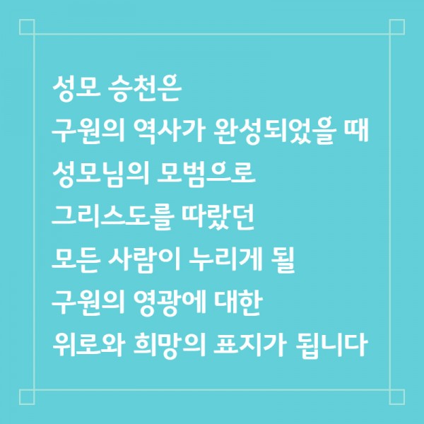 동정의 몸과 흠 없는 영혼이 누리시는 영광 그리고 부활하신 그리스도를 완전히 닮으심을 기념하는 축제일”(6장)이라 말씀하셨습니다.