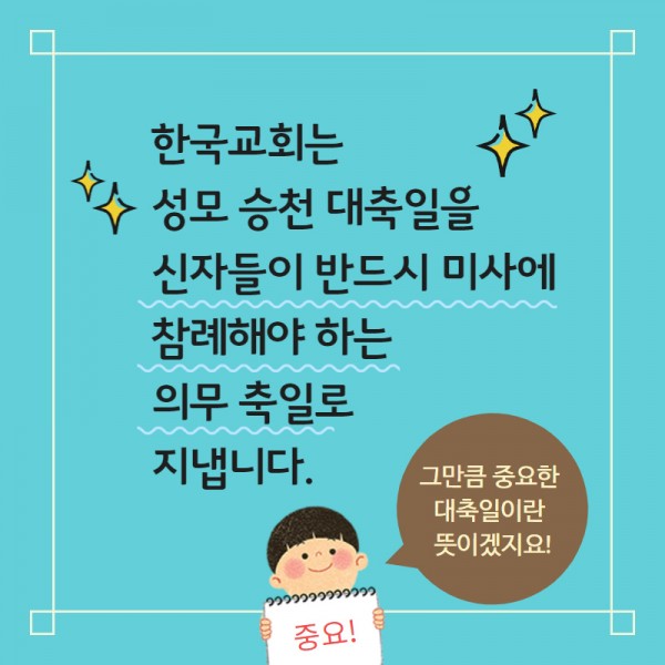 한국 교회는 성모승천대축일을 신자들이 반드시 미사에 참례해야 하는 의무 축일로 지냅니다.