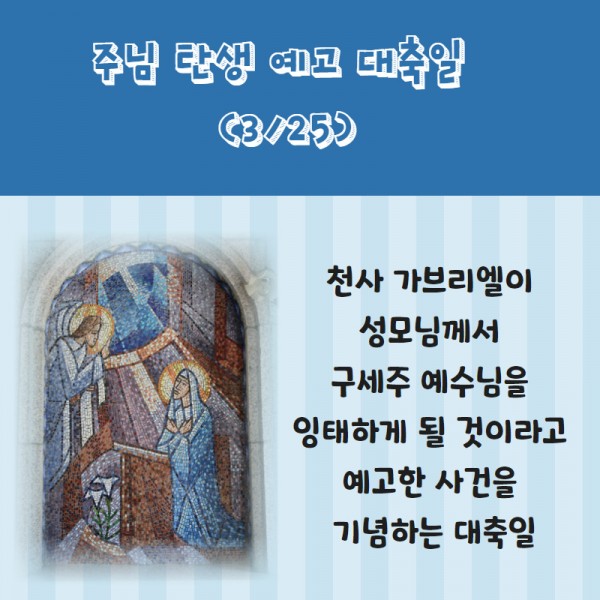 예수 성탄 대축일 (12/25)보다 정확히 9개월 앞서 지내는 이 축일은 천사 가브리엘이 성모 마리아에게 나타나