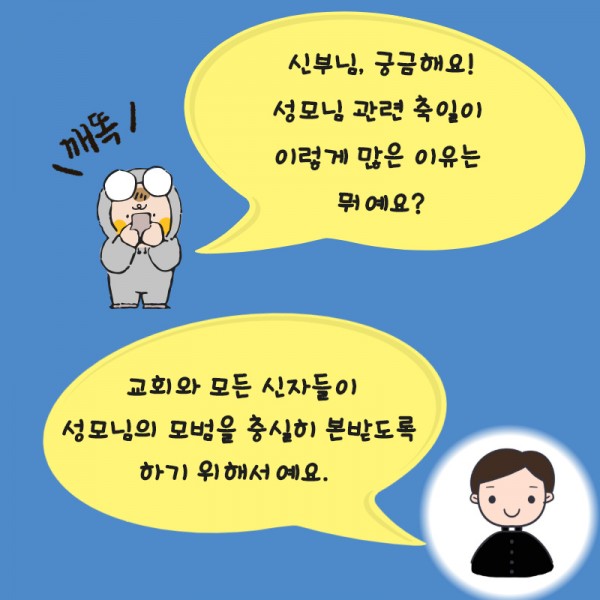 교회가 이처럼 전례력에 다양한 성모님 축일을 정해 기념하고 있는 것은 바로 성모님의 모범을 교회와 모든 신자들이 충실히 본받도록 하기 위해서입니다.
