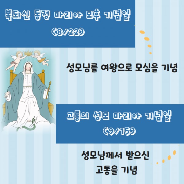 교회는 성모승천대축일(8/15) 외에도 성모 마리아와 관련된 다양한 축일을 지내고 있습니다.