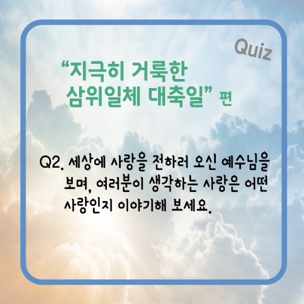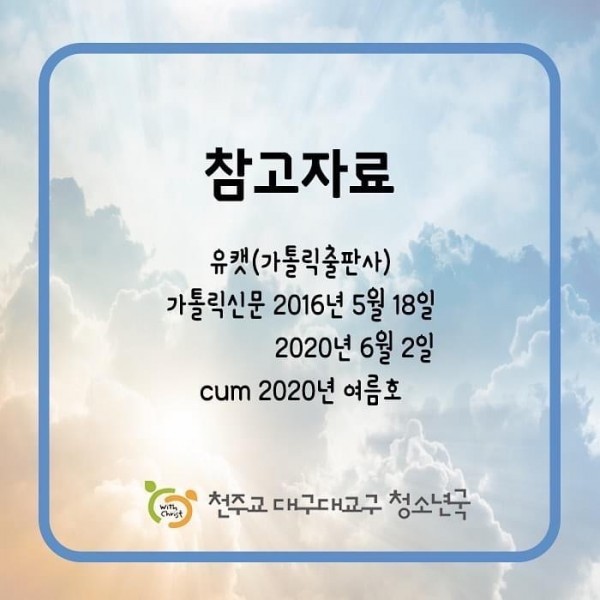청소년부 공지사항/공문 무지개 새하늘 새땅 미사 웹툰 갤러리 교리교사 교리교사 등록 교리자료 프로그램 자료 청소년 사목 자료실 학부모 공지사항 부모 양성 프로젝트 교육 교육 및 신청 청청에듀(온라인강의시스템) 청청센터 모임방 사용 신청 패밀리 사이트 (재)대구가톨릭청소년회 청년부 대학생부