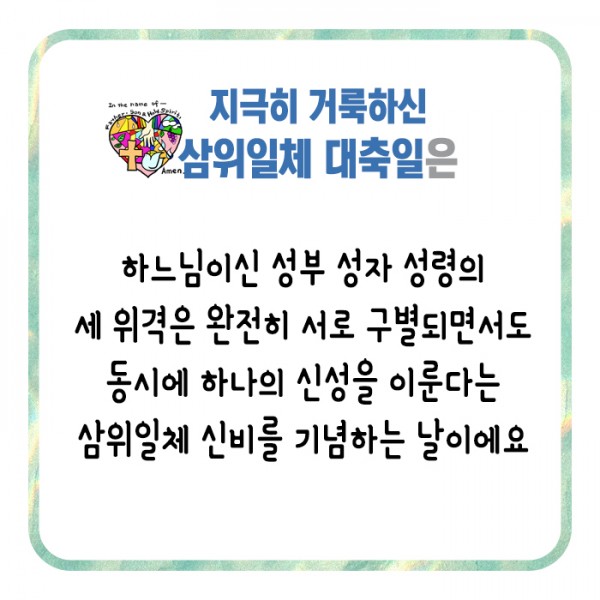 전례 시기별 교리 지극히 거룩하신 삼위일체 대축일 페이지 정보 작성자 관리자 댓글 0건 조회 792회 작성일 20-07-03 15:33 본문 [이 게시물은 관리자님에 의해 2022-01-27 15:36:34 교리자료에서 이동 됨] 댓글목록 댓글목록 등록된 댓글이 없습니다. 목록 이전글6월 예수성심성월 20.07.03 다음글성령 강림 대축일 20.07.03