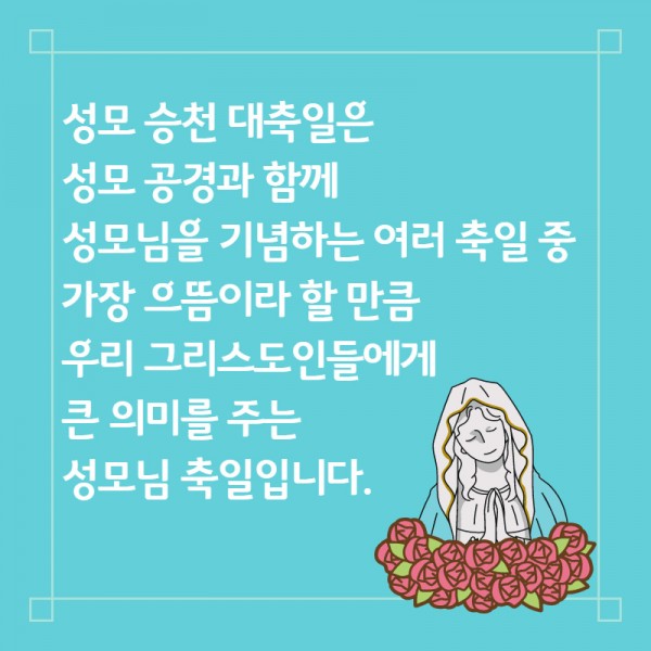 성모승천대축일은 성모님을 기념하는 여러 축일 중 가장 으뜸이라 할 수 있으며, 우리 그리스도인들에게 큰 의미를 주는 대축일이라 할 수 있습니다.