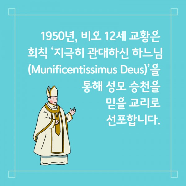 마침내 1950년, 비오 12세 교황은 회칙 「지극히 관대하신 하느님(Munificentissimus Deus)」’을 통해 성모 승천을 믿을 교리로 선포합니다.