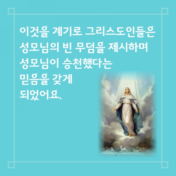 성모승천대축일은 성모님께서 지상에서의 생애을 마친 후, 영혼과 육신이 함께 하늘 나라로 들어 높여지셨음을 기념하는 날입니다.