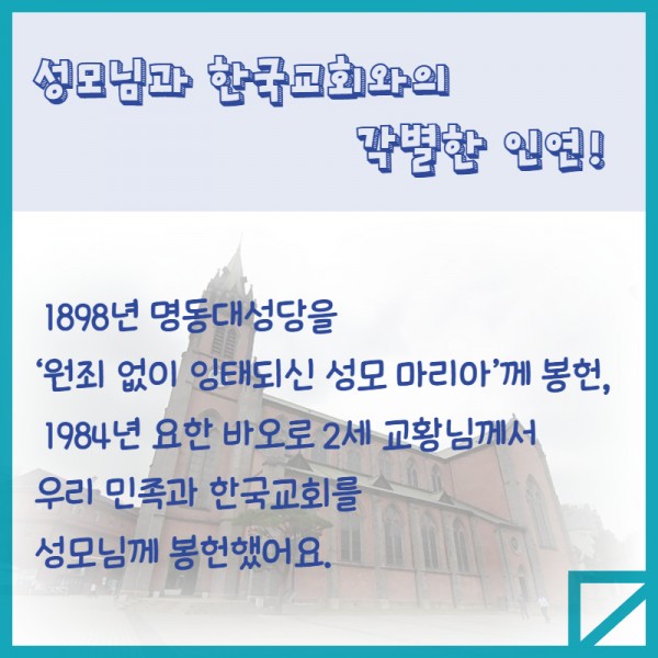 성모님에 대한 한국교회의 사랑과 공경은 일찍부터 특별했습니다. 성모님은 한국교회의 수호성인입니다.