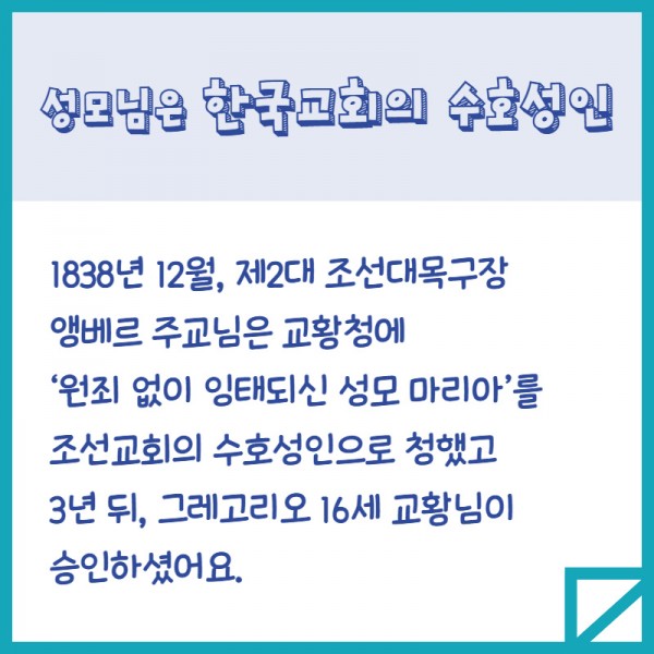 제2대 조선대목구장 앵베르 주교님은 1838년 12월, 교황청에 '원죄 없이 잉태되신 성모 마리아'를 조선교회의 수호성인으로 청했고 3년 뒤,