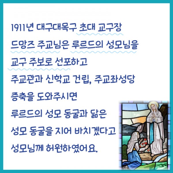 1911년 조선대목구에서 대구대목구가 분리·설치되면서 대구에 부임한 초대 교구장 드망즈 주교님은 부임 직후 루르드의 성모님을 교구 주보로 선포하고,