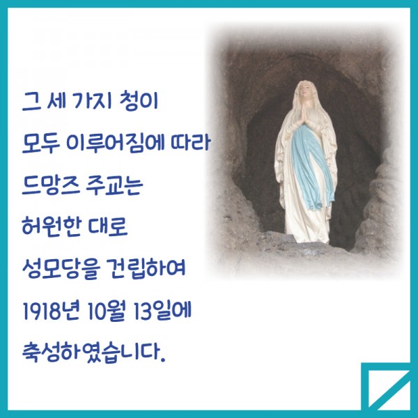 그 세 가지 청이 모두 이루어짐에 따라 드망즈 주교님은 약속대로 성모당을 건립하여 1918년 10월 13일에 축성하였습니다.