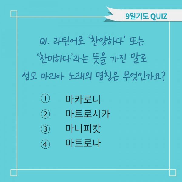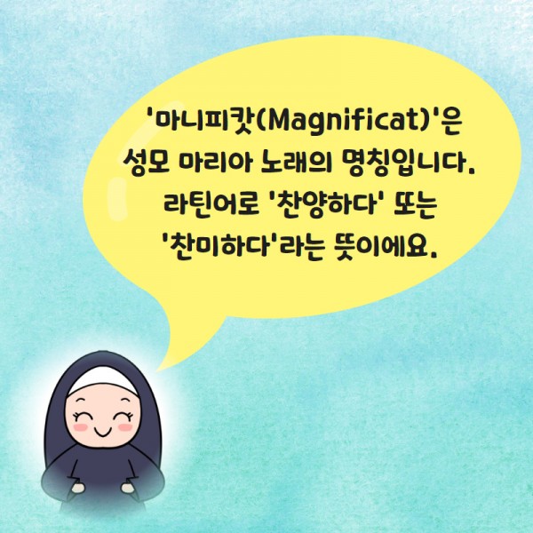 마니피캇(Magnificat)은 라틴어로 ‘찬양하다’ 또는 ‘찬미하다’ 라는 뜻으로, 루카 복음 1장 46절에서 55절에 나오는 성모님의 노래를 부르는 명칭입니다.