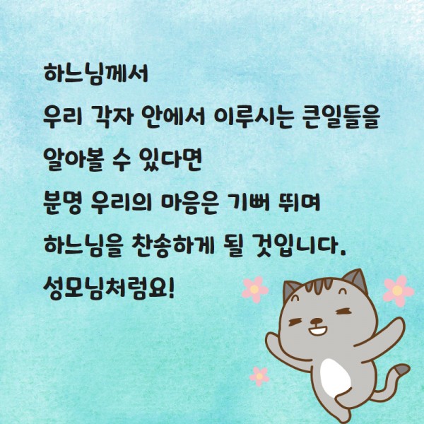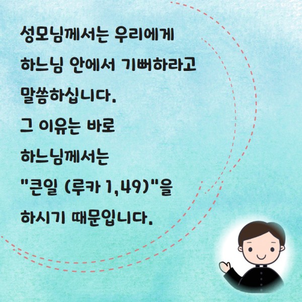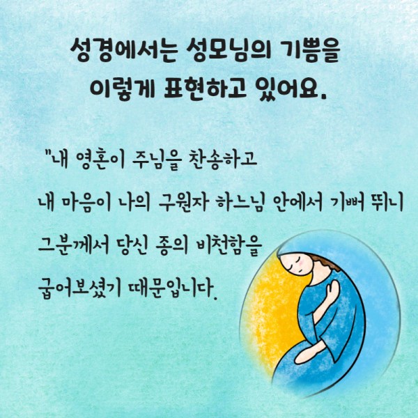 하느님께서는 우리 각자 안에서 큰일들을 이루십니다. 우리도 성모님처럼 이 큰일들을 알아 볼 수 있다면 분명 우리의 마음은 기뻐 뛰며 하느님을 찬송하게 될 것입니다.