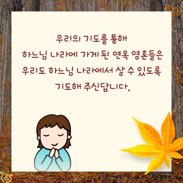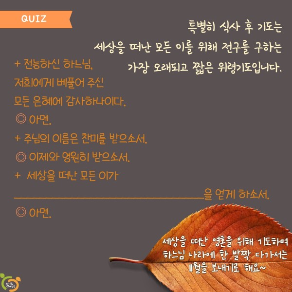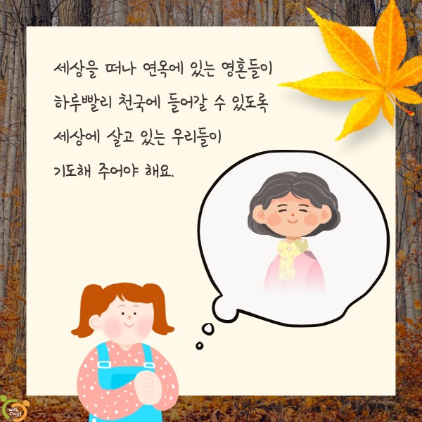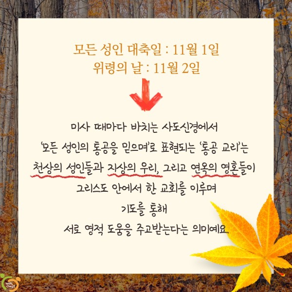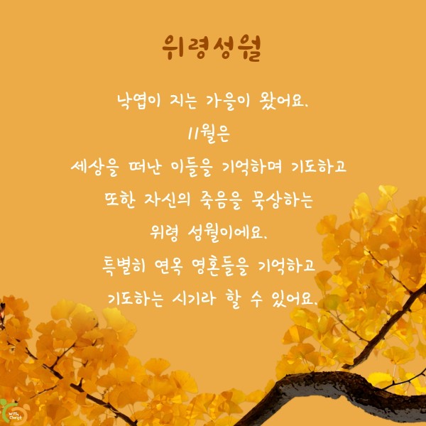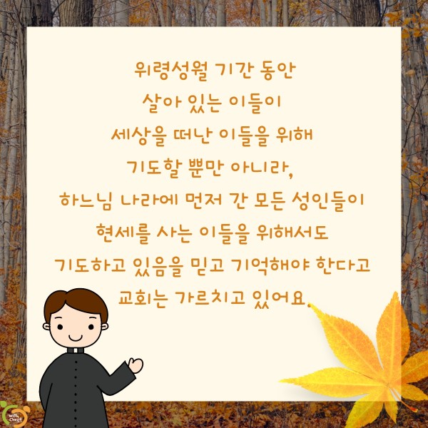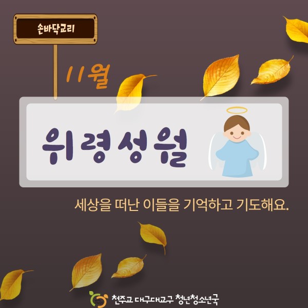성월 교리 11월 위령성월 페이지 정보 작성자 관리자 댓글 0건 조회 937회 작성일 21-11-04 17:31 본문 [2021년 11월 7일] 연중 제32주일 (평신도주일) - 11월 위령성월 [이 게시물은 관리자님에 의해 2022-01-27 15:33:18 교리자료에서 이동 됨] 댓글목록 댓글목록 등록된 댓글이 없습니다. 검색 목록 이전글손바닥 교리 : 10월 묵주기도 성월 20.10.01