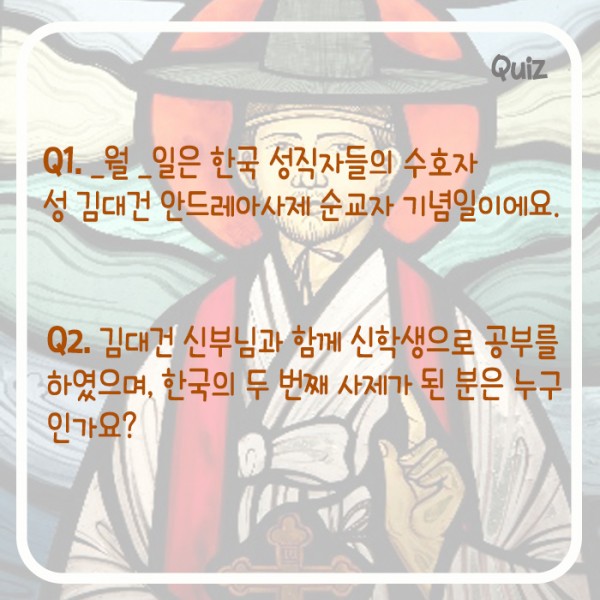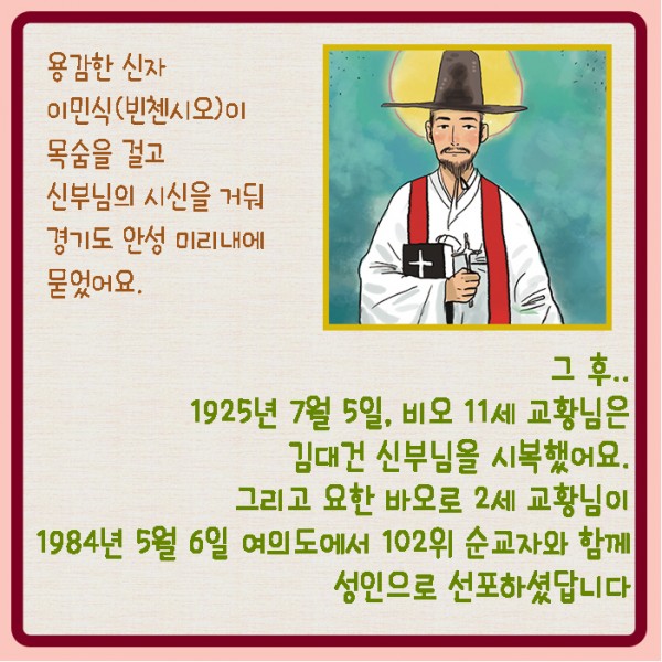 전례 시기별 교리 한국 성직자들의 수호자 성 김대건 안드레아 사제 순교자 대축일 페이지 정보 작성자 관리자 댓글 0건 조회 1,002회 작성일 20-07-10 23:09 본문 [이 게시물은 관리자님에 의해 2022-01-27 15:36:34 교리자료에서 이동 됨] 댓글목록 댓글목록 등록된 댓글이 없습니다. 목록 이전글9월 순교자성월 - 성 이윤일 요한 20.09.09 다음글교황주일 20.07.03