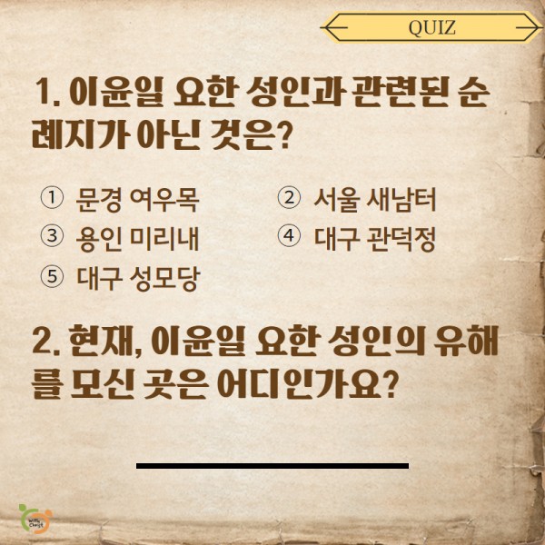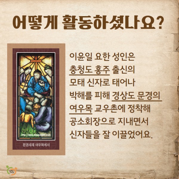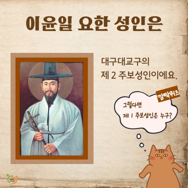 성월 교리 9월 순교자성월 - 성 이윤일 요한 페이지 정보 작성자 관리자 댓글 0건 조회 394회 작성일 20-09-09 14:21 본문 대구 대교구 제2주보 성인, 성 이윤일 요한 [이 게시물은 관리자님에 의해 2022-01-27 15:36:34 교리자료에서 이동 됨] 댓글목록 댓글목록 등록된 댓글이 없습니다. 목록 이전글9월 순교자성월 - 성 정하상 바오로 20.09.16 다음글한국 성직자들의 수호자 성 김대건 안드레아 사제 순교자 대축일 20.07.10