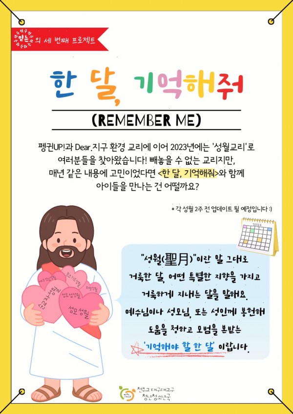 성월 교리 한 달, 기억해줘 안내문 페이지 정보 작성자 관리자 댓글 0건 조회 1,323회 작성일 23-02-17 14:22 본문 pdf를 참조하세요. [이 게시물은 관리자님에 의해 2024-09-09 15:31:17 교리자료에서 이동 됨] 댓글목록 댓글목록 등록된 댓글이 없습니다. 목록 이전글[한 달, 기억해줘] 3월 성 요셉 성월 23.02.17 다음글사순 시기 교리자료_너 나를 사랑하느냐 활동지 23.02.17